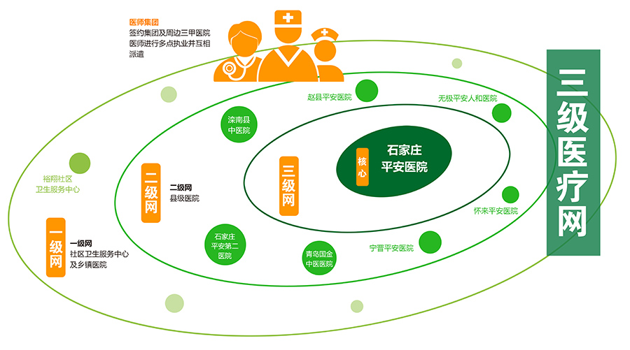以石家莊平安醫(yī)院為三級醫(yī)療網(wǎng)的核心,以集團(tuán)八家醫(yī)院輻射的縣級醫(yī)院為二級醫(yī)療網(wǎng),以社區(qū)衛(wèi)生服務(wù)中心及鄉(xiāng)鎮(zhèn)衛(wèi)生院為一級網(wǎng),搭建平安健康集團(tuán)的三級醫(yī)療網(wǎng),平安醫(yī)院作為三級醫(yī)療網(wǎng)的技術(shù)服務(wù)指導(dǎo)中心,急危重癥患者逐級轉(zhuǎn)診至上一級醫(yī)療機(jī)構(gòu),集團(tuán)內(nèi)部醫(yī)生及三甲醫(yī)院的醫(yī)師進(jìn)行多點(diǎn)執(zhí)業(yè)并互相派遣。