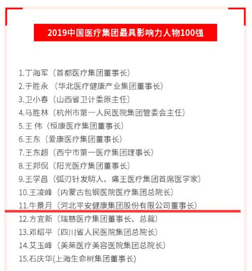 中國醫(yī)療健康行業(yè)評價評選專門機構《醫(yī)醫(yī)團》主辦的2019中國醫(yī)療健康影響力排行榜暨十大、100強評選名單公布,河北平安健康集團董事長牛景月先生入圍“2019中國醫(yī)療集團最具影響力人物100強”。