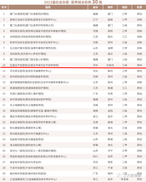 2023屆社會(huì)辦醫(yī)·醫(yī)養(yǎng)結(jié)合機(jī)構(gòu)30強(qiáng)公布!石家莊平安醫(yī)院再次衛(wèi)冕